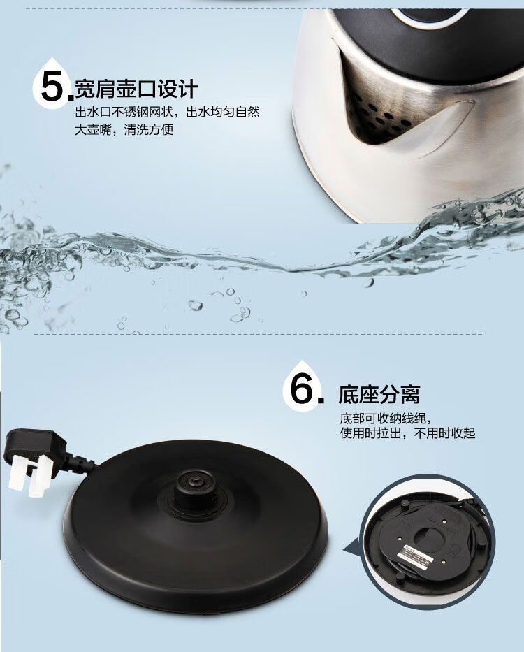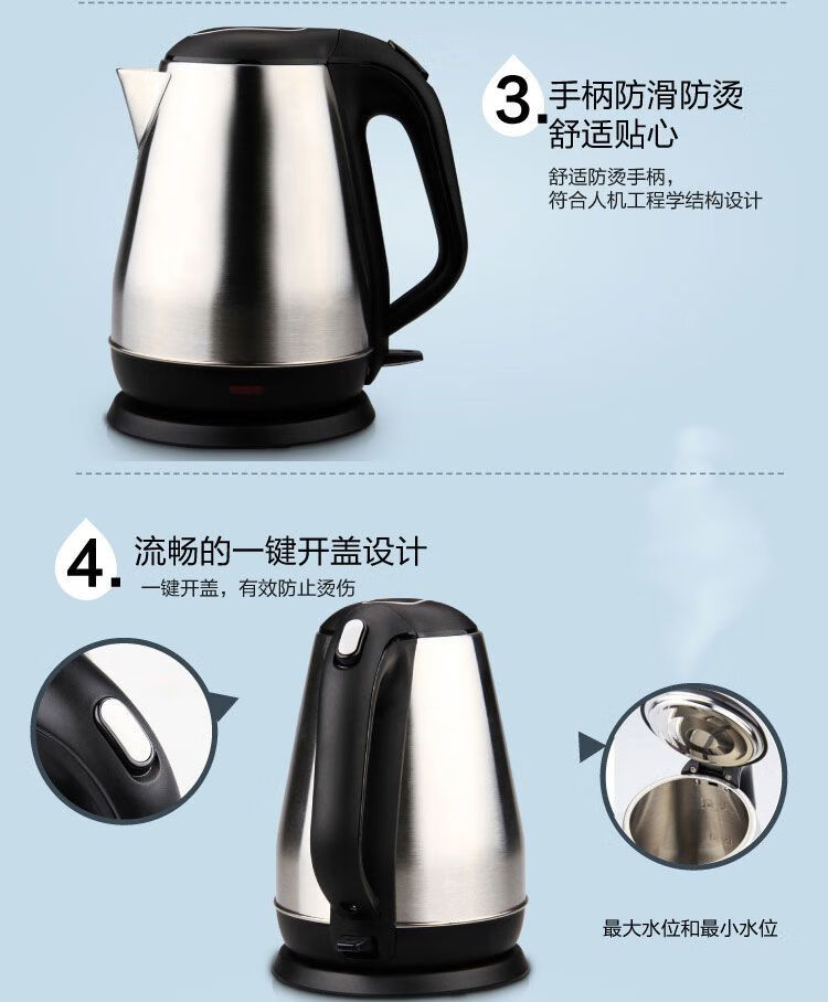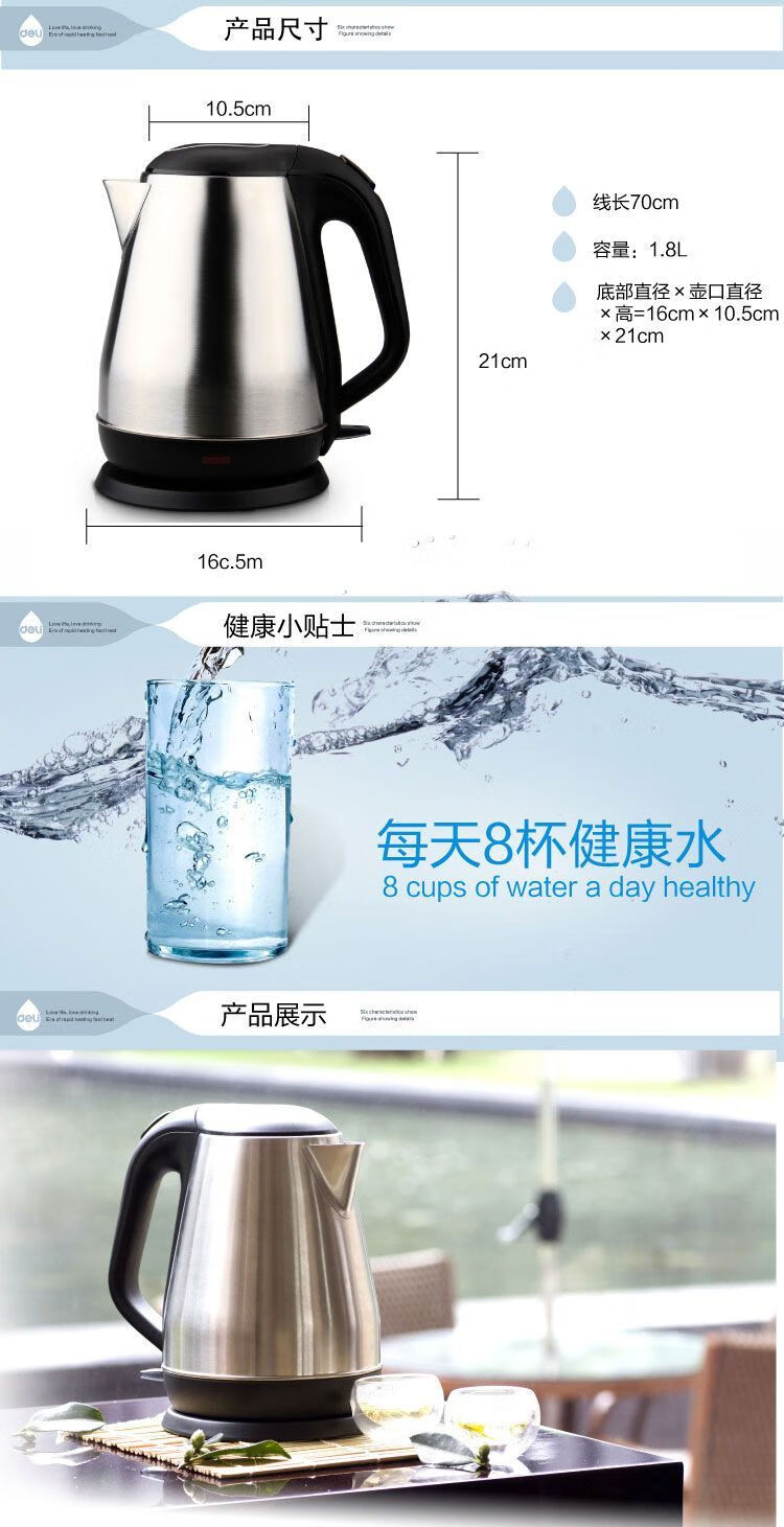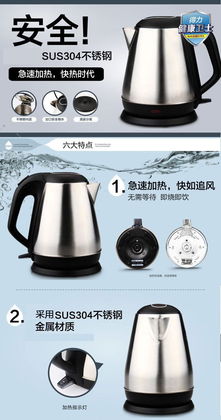 商品名稱:得力0764 電水壺 不銹鋼防燙傷電熱水壺雙層防滑燒水壺1.8L 自動(dòng)斷電