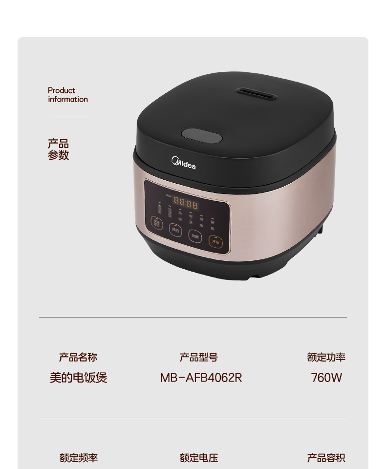 商品名稱:美的MB-AFB4062R 電飯煲 電飯鍋底盤加熱智能自動4L不粘鍋聚能釜定時預(yù)約燒湯燒飯