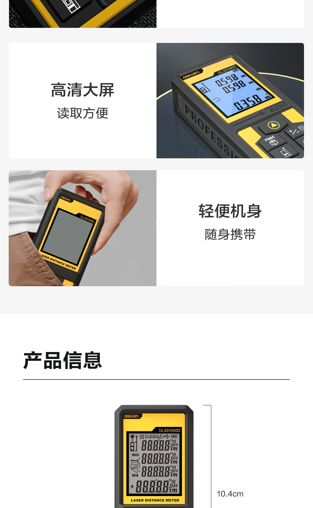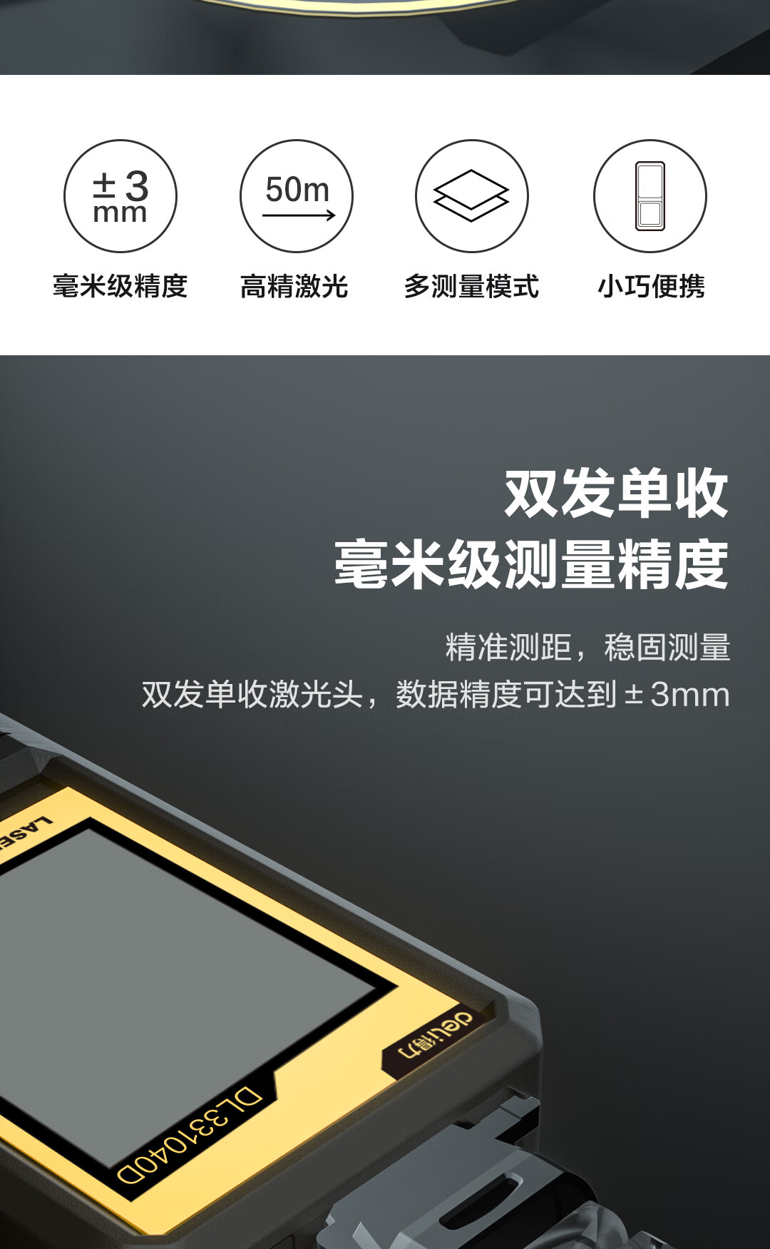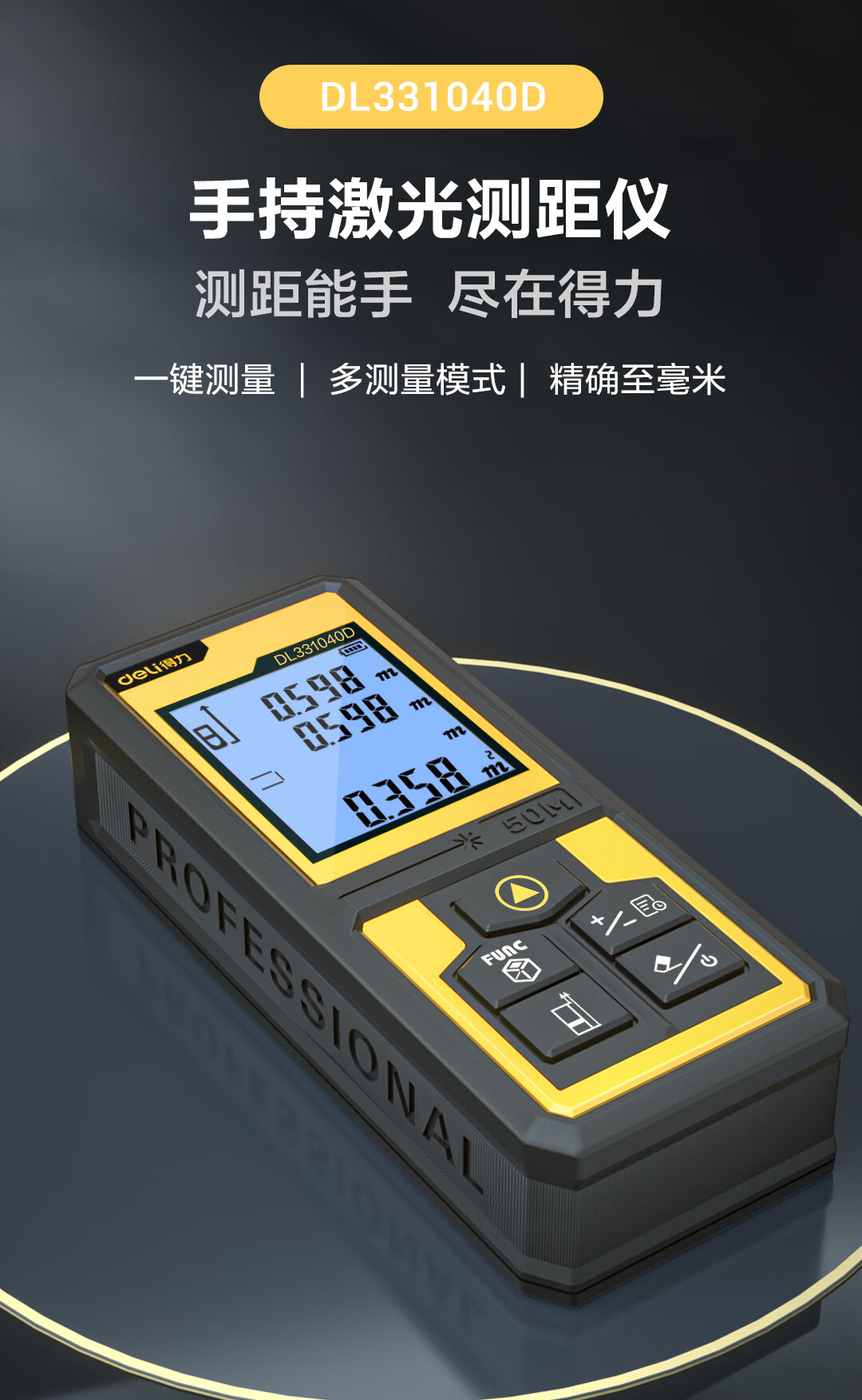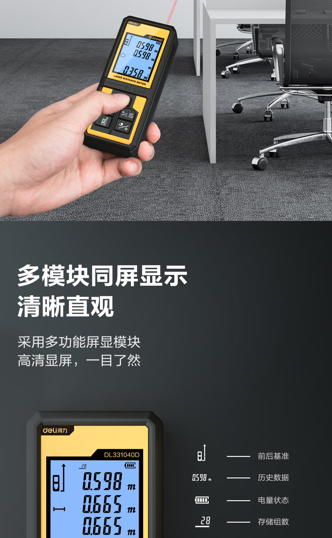 商品名稱(chēng):得力DL331040D 測(cè)距儀 手持式激光高精度電子尺紅外量房?jī)x50米量程毫米級(jí)精度