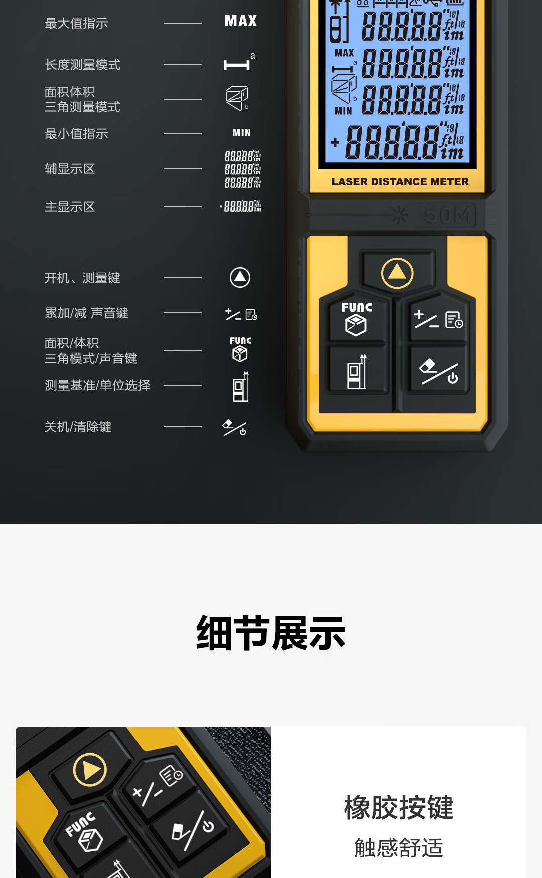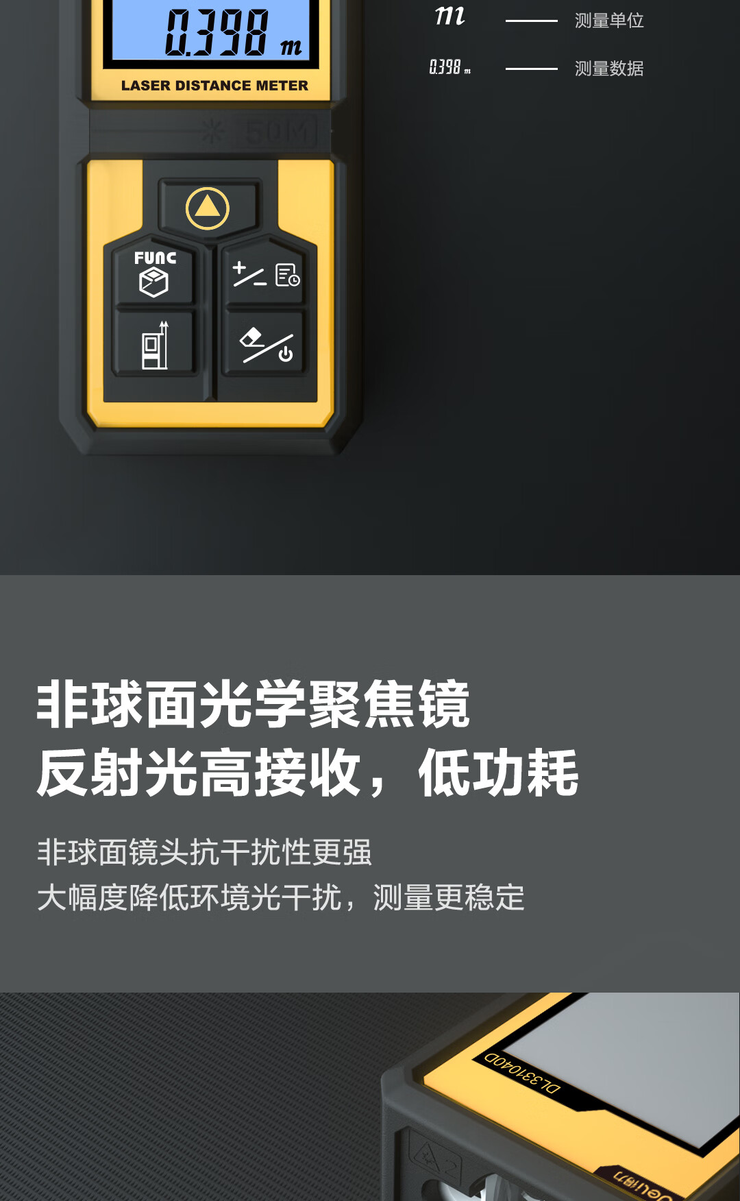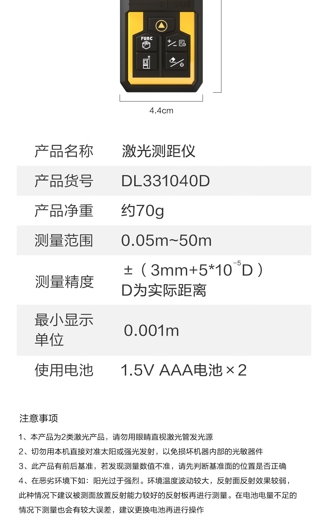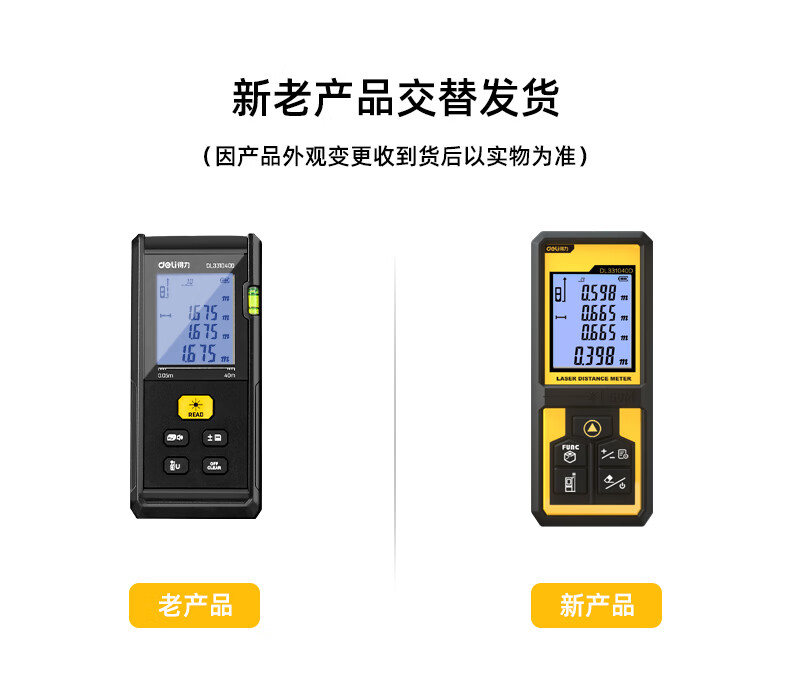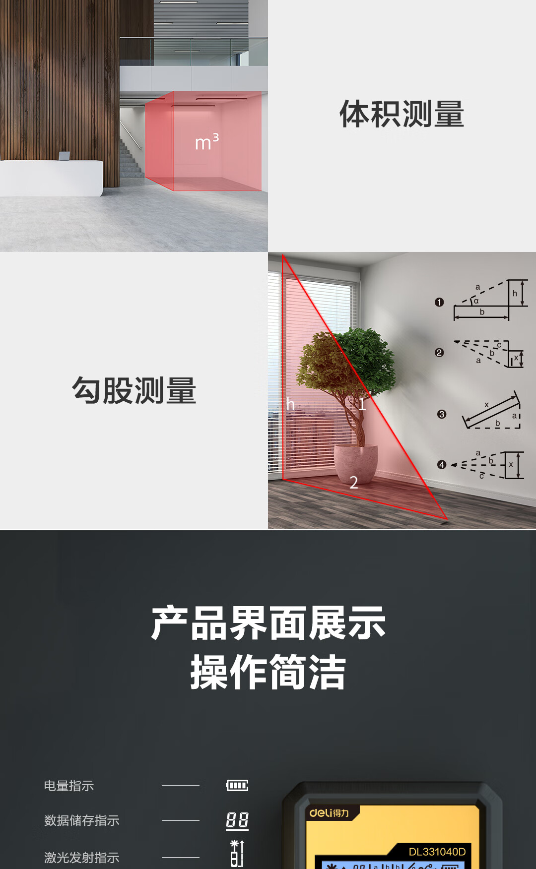 商品名稱(chēng):得力DL331040D 測(cè)距儀 手持式激光高精度電子尺紅外量房?jī)x50米量程毫米級(jí)精度