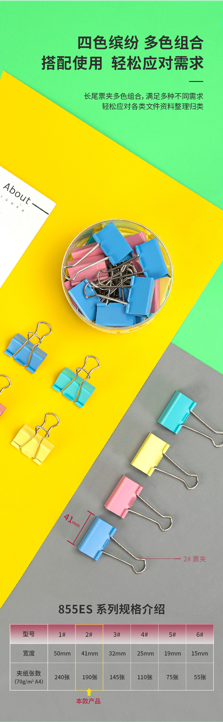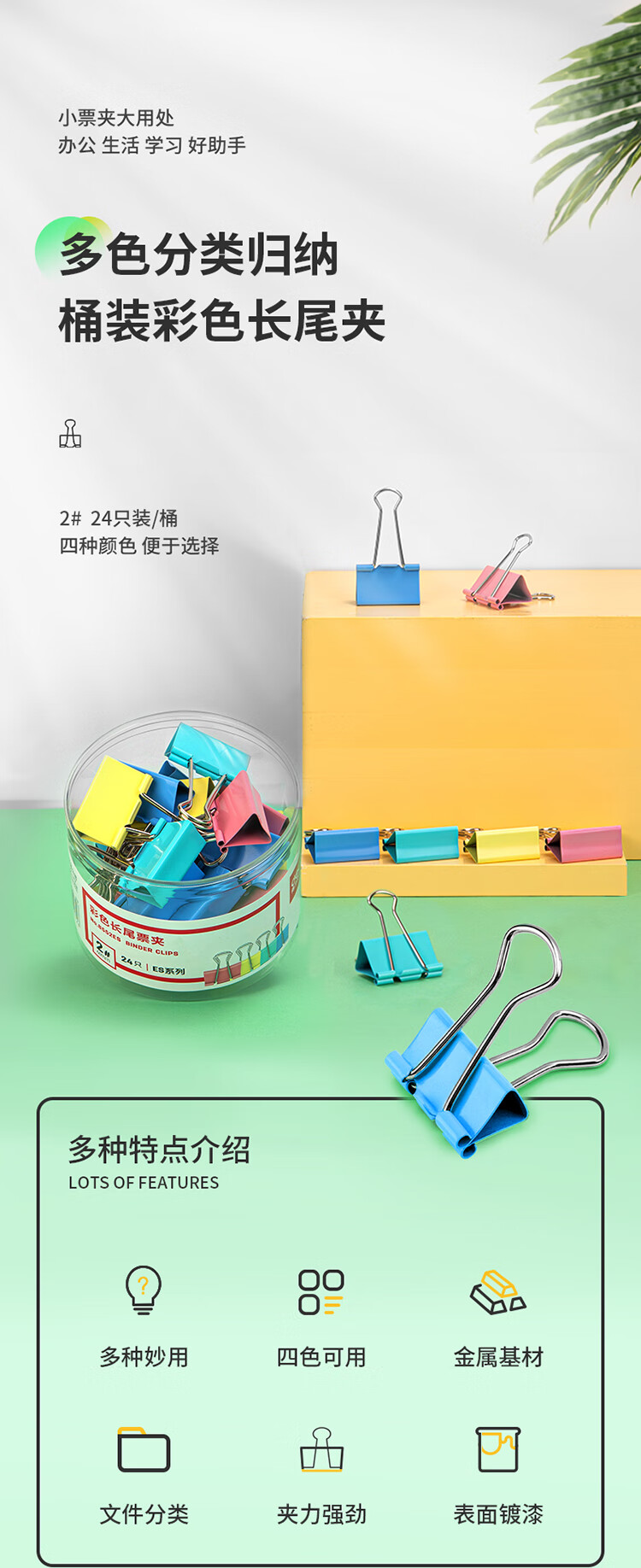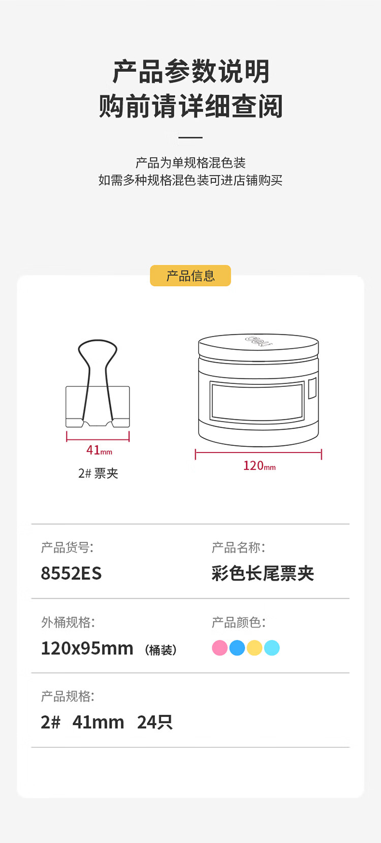 商品名稱:得力8552ES 彩色長(zhǎng)尾夾 2#41mm大號(hào)金屬票夾燕尾夾票據(jù)文件夾子 辦公用品 24只/筒