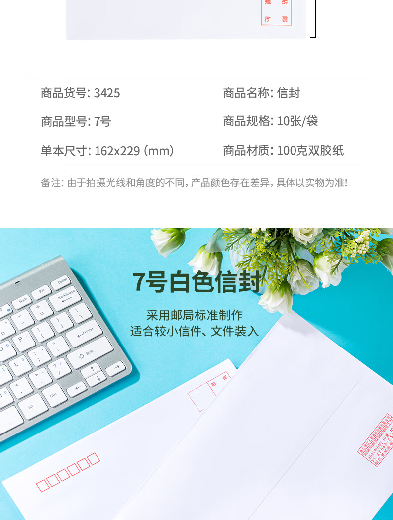 商品名稱:得力3425 白色信封 7號郵局標(biāo)準(zhǔn)信封229*162mm 10張/包