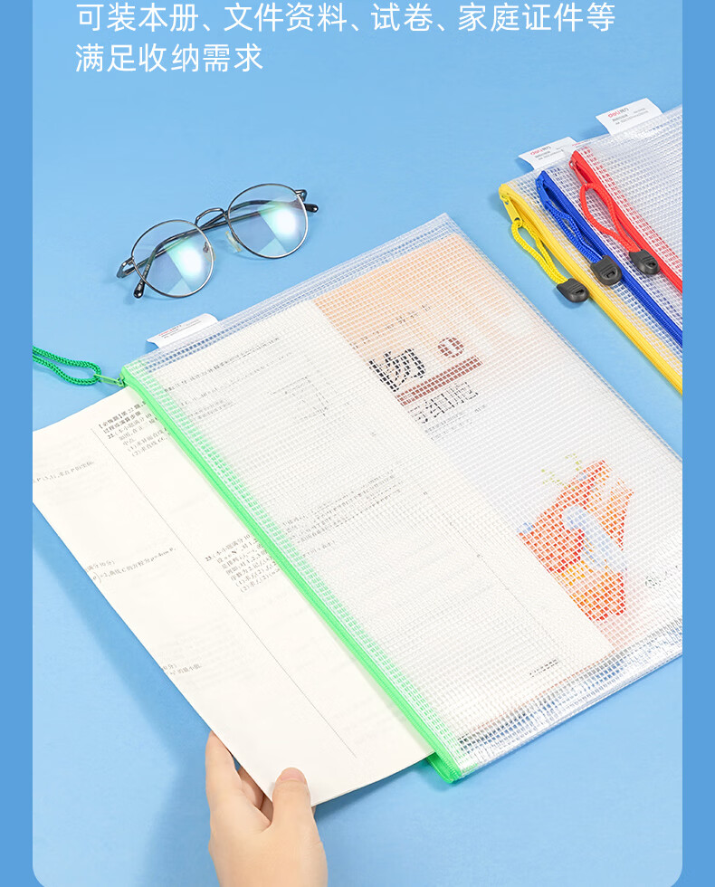 自營(yíng)得力5654 網(wǎng)格拉鏈袋 A4收納袋透明文件袋資料袋科目袋學(xué)科袋 顏色隨機(jī) 單個(gè)裝