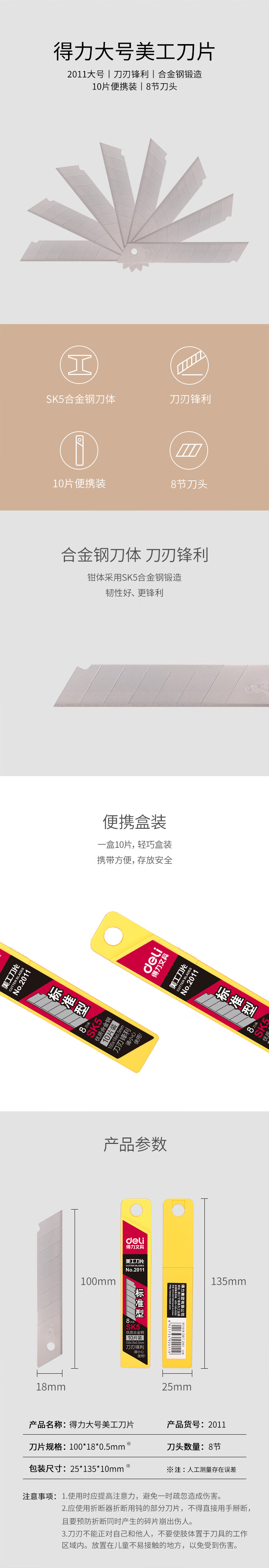 商品名稱:得力2011 美工刀片 8刀頭SK5合金鋼大號裁紙刀片便攜裝 辦公用品 10片/盒