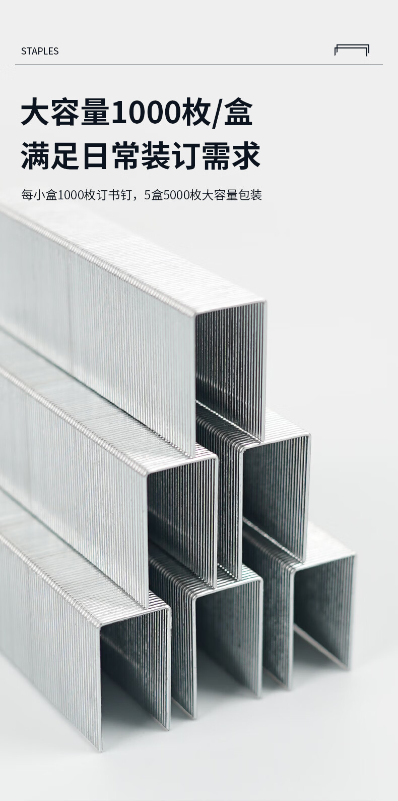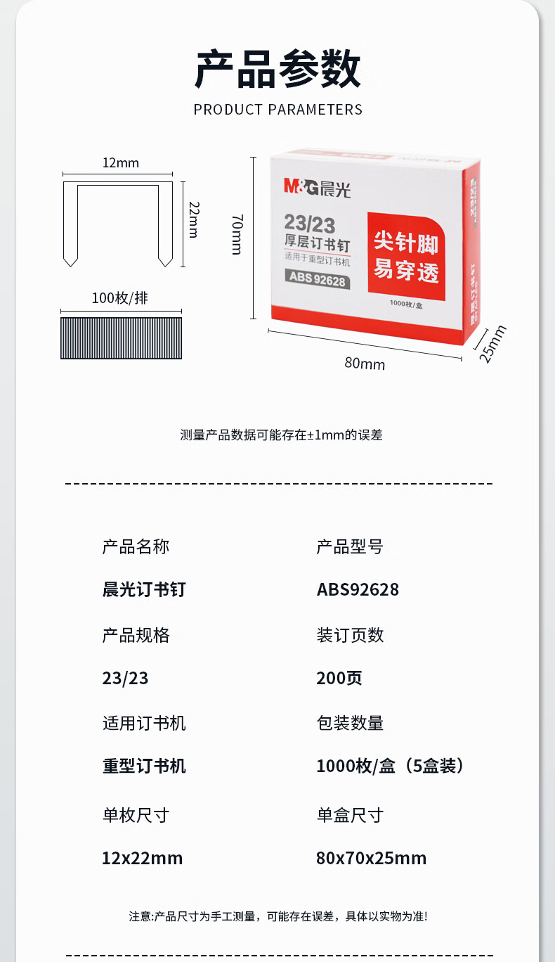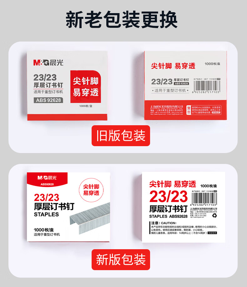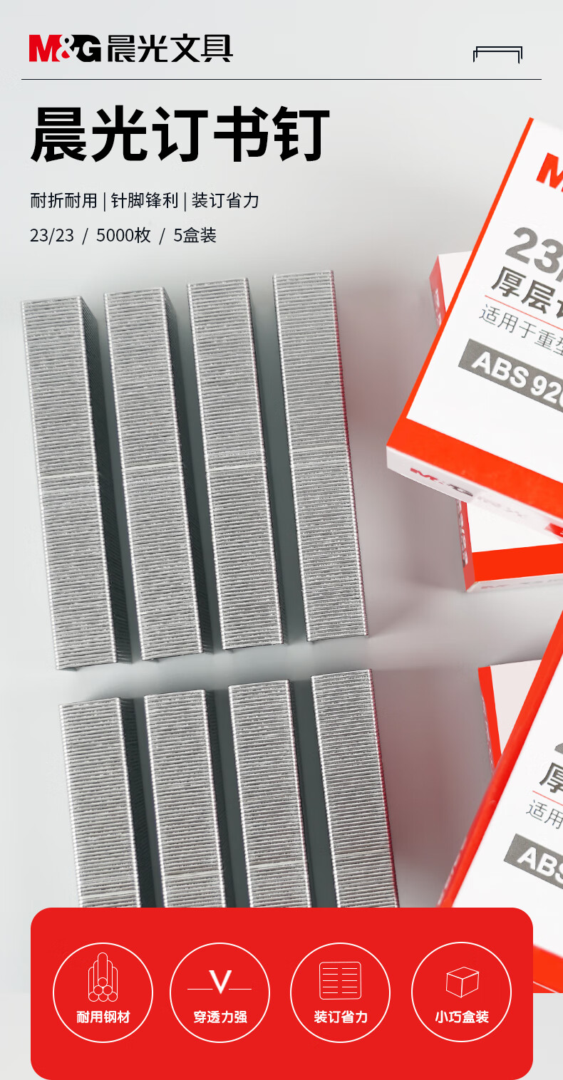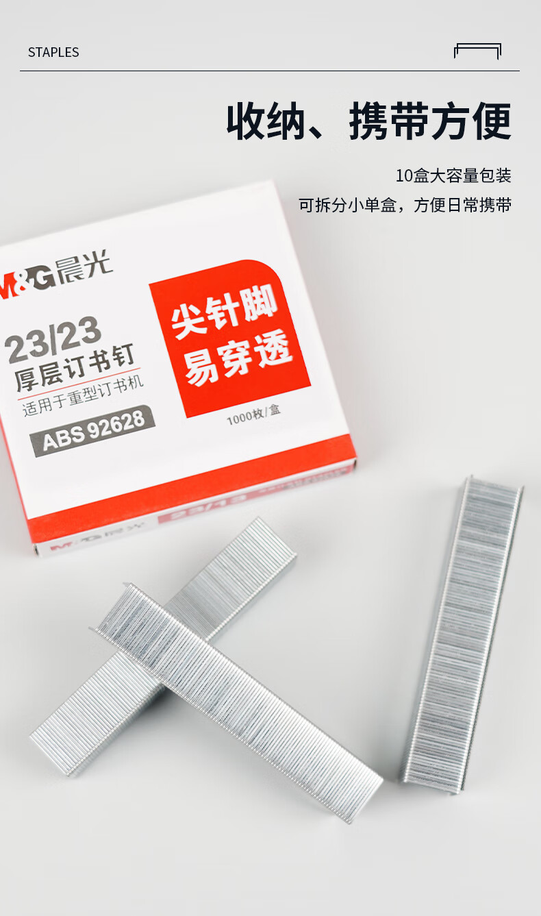 商品名稱:晨光ABS92628 訂書釘 23/23號(hào)厚層易穿透重型訂書針 辦公用品 1000枚/盒 5盒裝