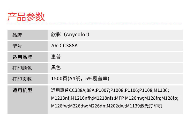 商品名稱(chēng):欣彩 AR-CC388A專(zhuān)業(yè)版 硒鼓 適用惠普 P1007/P1008/P1106/P1108/M1136/M1213nf/M1216nfh 黑色