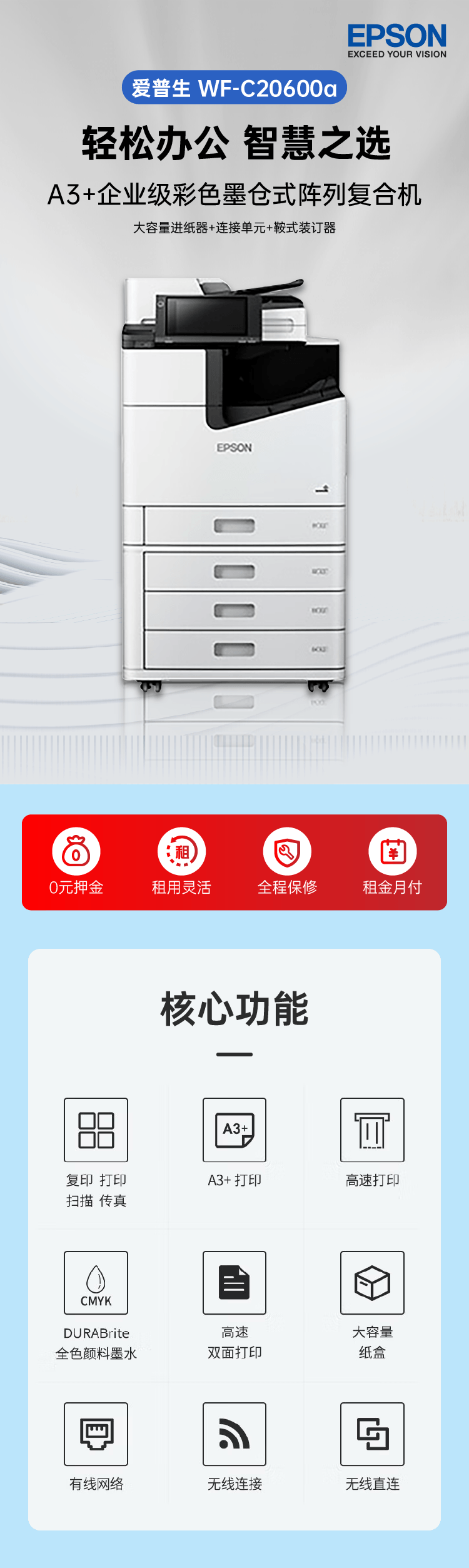 商品名稱:愛普生全新復(fù)印機(jī)租賃 茂名出租A3超高速彩色噴墨復(fù)合機(jī)(月)