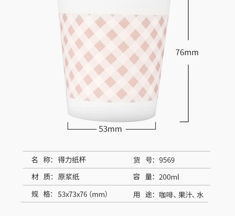 商品名稱:得力9569 一次性紙杯 200ml木漿紙網(wǎng)格加厚杯子/水杯 50只/包